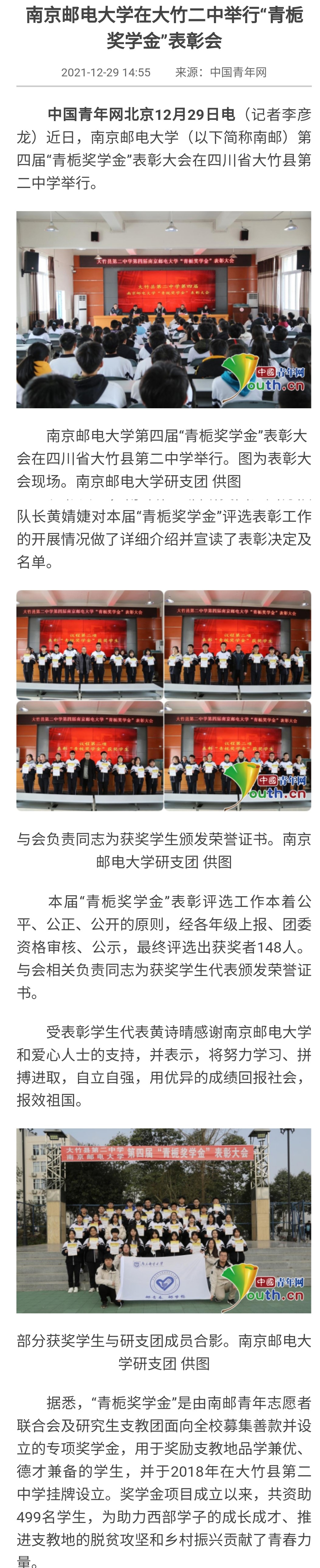 【中國青年網】南京郵電大學在大竹二中舉行“青梔獎學金”表彰會