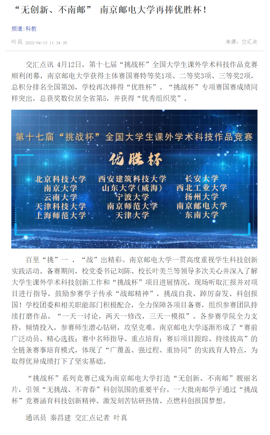 【新華日報客戶端】“無創(chuàng)新、不南郵” 南京郵電大學再捧優(yōu)勝杯!