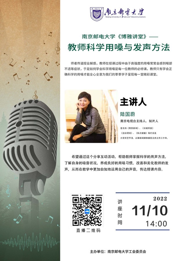 校工會文化潤校系列活動——《博雅講堂》將于11月10日(周四)14:00舉辦《教師科學用嗓與發聲方法》講座。