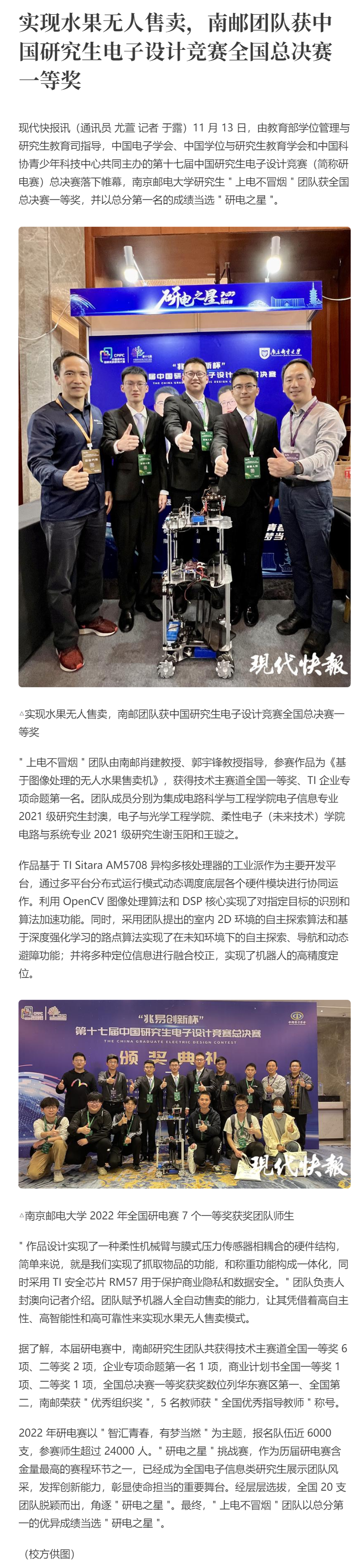 【現(xiàn)代快報全媒體】實現(xiàn)水果無人售賣,南郵團隊獲中國研究生電子設(shè)計競賽全國總決賽一等獎
