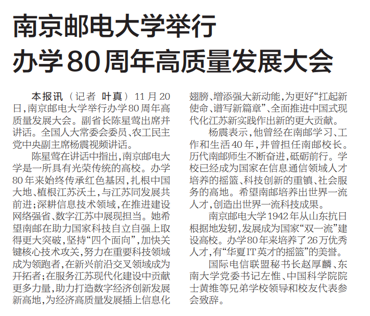 【新華日報(bào)】南京郵電大學(xué)舉行辦學(xué)80周年高質(zhì)量發(fā)展大會