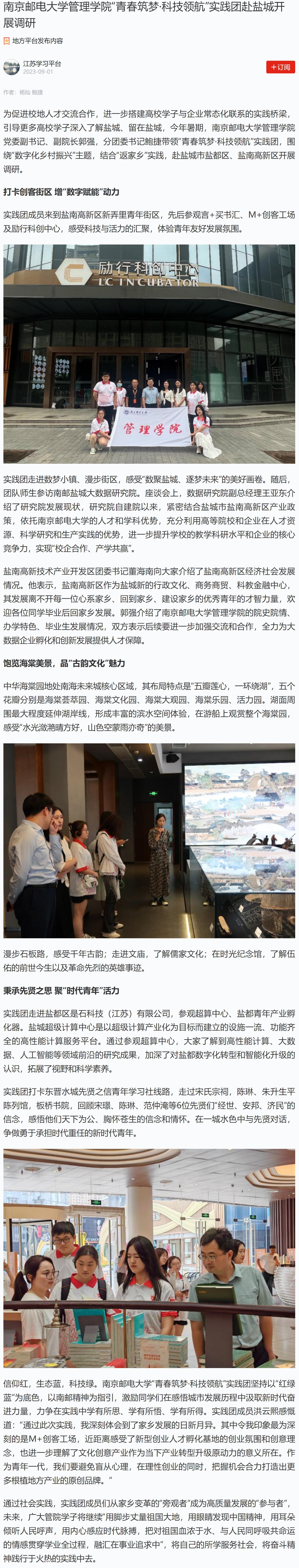 【學習強國】南京郵電大學管理學院“青春筑夢·科技領航”實踐團赴鹽城開展調(diào)研