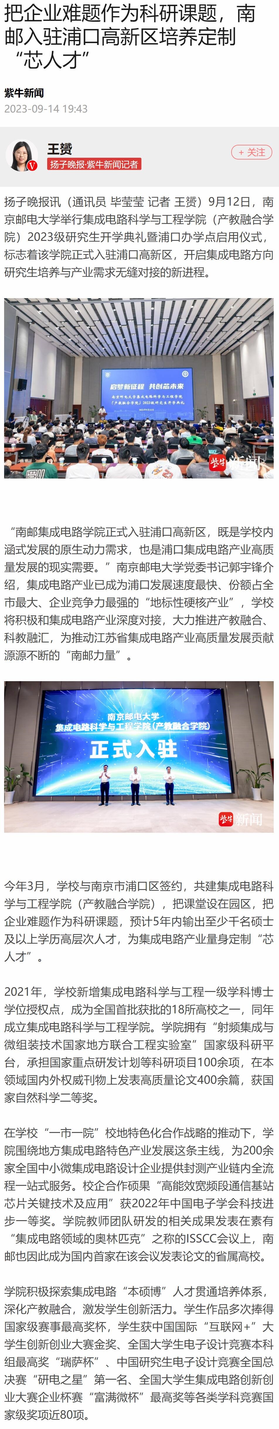【揚子晚報客戶端】把企業難題作為科研課題,南郵入駐浦口高新區培養定制“芯人才”