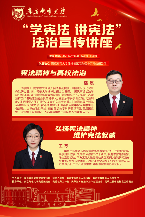 在國家憲法日來臨之際,我校邀請南京市玄武區人民法院、南京市鼓樓區人民檢察院來校開展“12.4”國家憲法日活動暨“學憲法講憲法”法治宣傳講座,歡迎我校廣大師生積極參加。