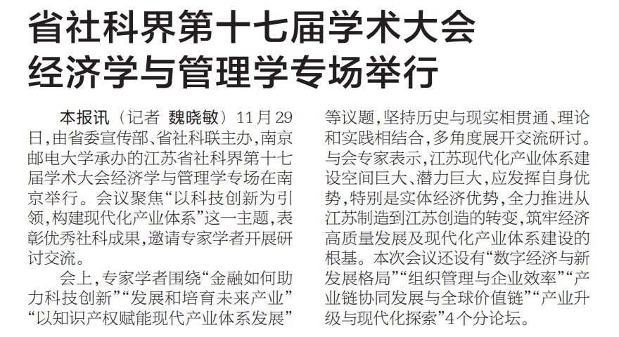 【新華日報】省社科界第十七屆學術大會經濟學與管理學專場舉行