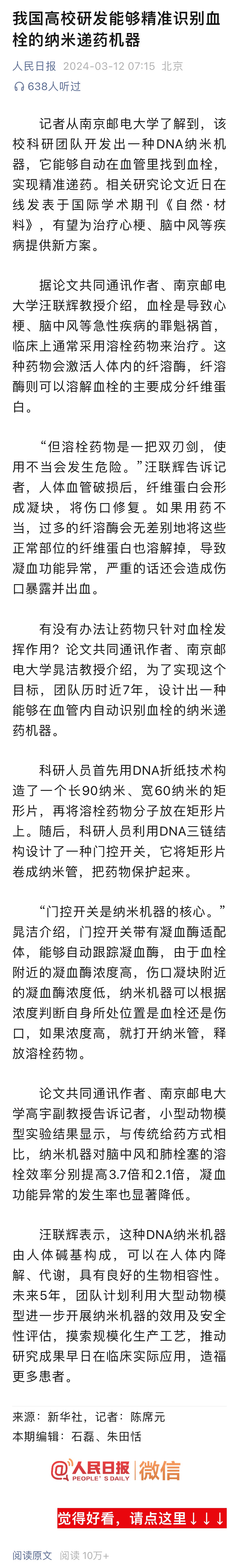 【人民日報微信客戶端】我國高校研發能夠精準識別血栓的納米遞藥機器