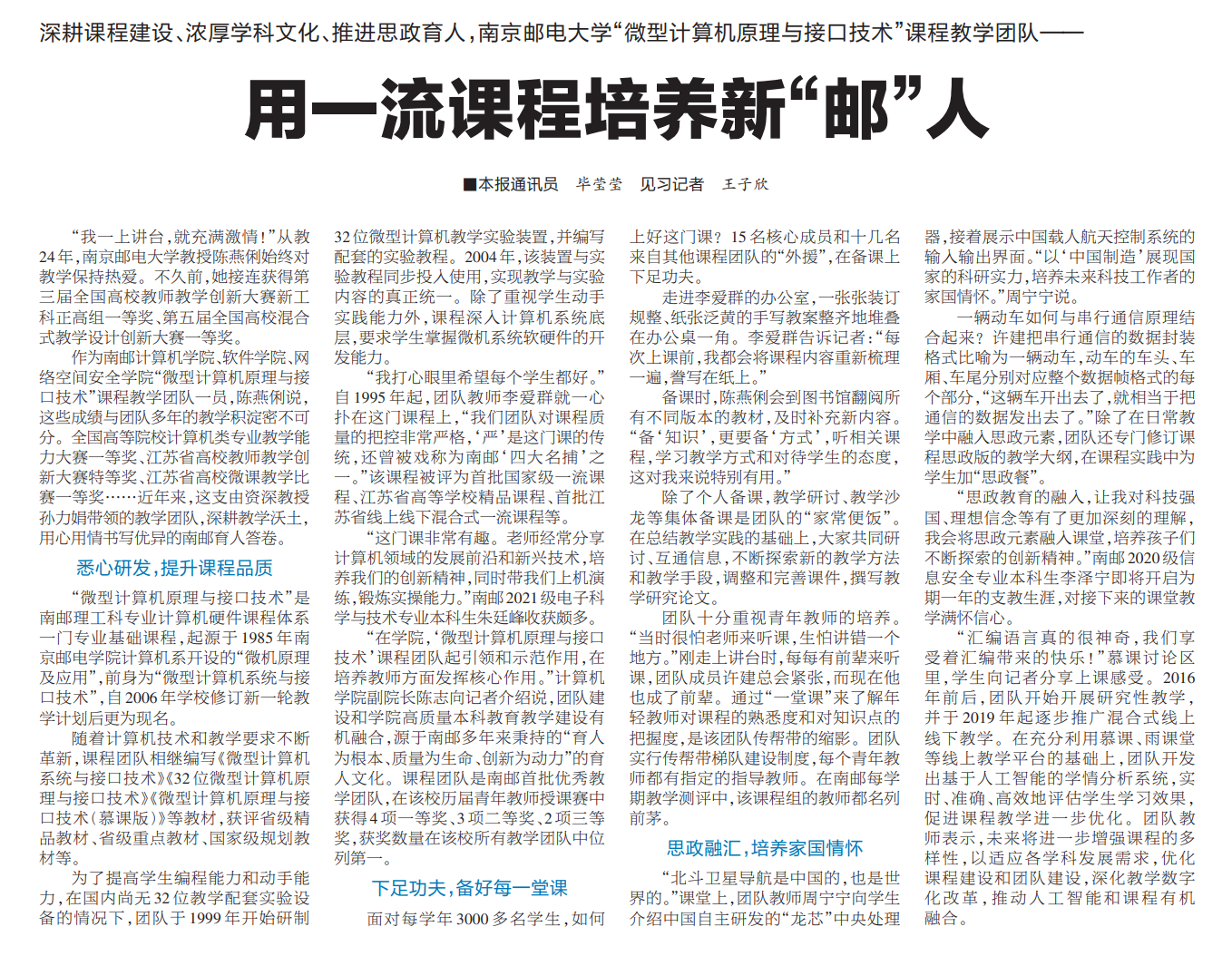 【江蘇教育報】南京郵電大學“微型計算機原理與接口技術”課程教學團隊用一流課程培養新“郵”人