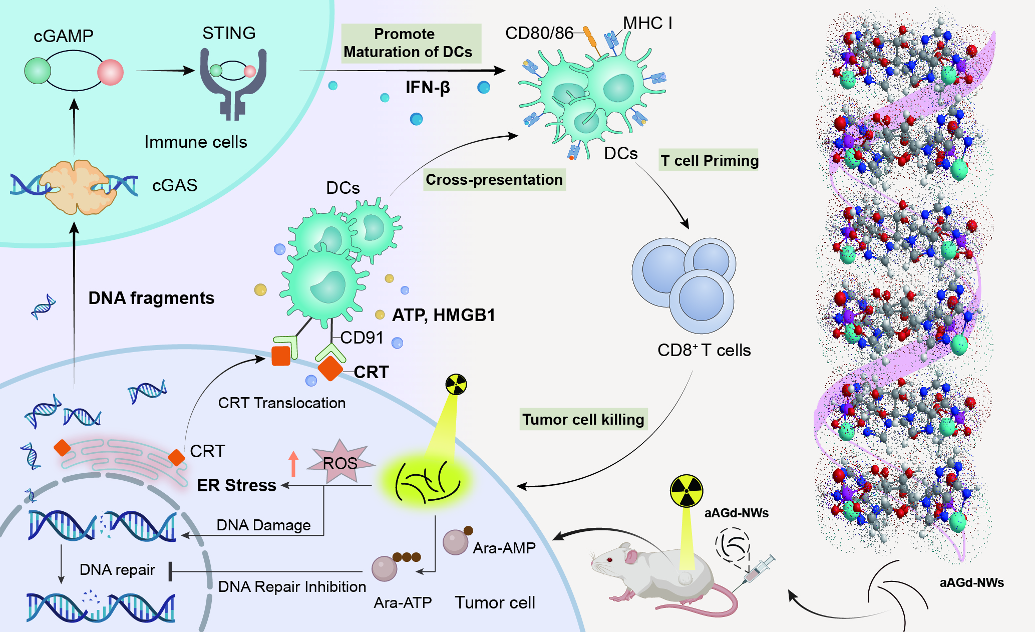 腫瘤的放射治療相當于接種了內源性原位疫苗,但這種僅由放射治療引發的內源性原位疫苗的效應非常微弱,幾乎不能誘導全身性的抗腫瘤免疫反應。團隊基于臨床抗病毒藥物(單磷酸阿糖腺苷)與核磁造影劑(釓離子)通過配位自組裝和相調控技術,開發了手性阿糖腺苷磷酸釓納米線(aAGd-NWs)來增強放療誘導的腫瘤原位疫苗效應。在清華大學崔曉亞博士、蘇家躍博士和劉濤老師的幫助下,團隊通過冷凍透射電鏡解析了aAGd-NWs的結構特征,包括超細形貌、表面配位和右手螺旋手性,并闡明了aAGd-NWs手性自組裝的機制。在生物機制上,aAGd-NWs不僅增強了X射線沉積和散射,增強放療的敏感性,而且有效抑制腫瘤細胞DNA的自我修復,有效激活cGAS-STING通路促進I型干擾素的分泌,增加了CD8+ T細胞在腫瘤組織中的浸潤。協同免疫檢查點阻斷療法顯著增強了放療誘導的原位疫苗效應。