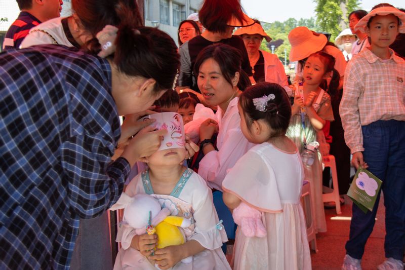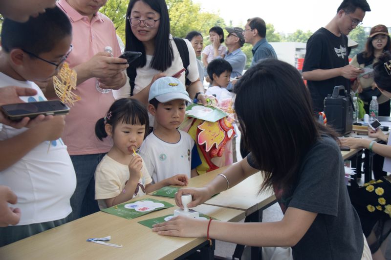 在糖畫制作現場,傳統藝人手把手指導設計和制作糖畫,小朋友們將腦海的構圖,變成現實中的糖畫,又化作舌尖的美味。在面部彩繪現場,小朋友們排成長龍,選擇心儀的圖案,大膽接受彩繪,興奮地與父母合影留念。在留學生展臺,來自摩洛哥、孟加拉等國的留學生穿戴各國服飾,伴隨曼妙音樂翩翩起舞,小朋友們認真地揣摩舞步,感受他國文化。