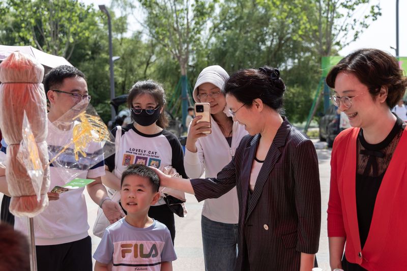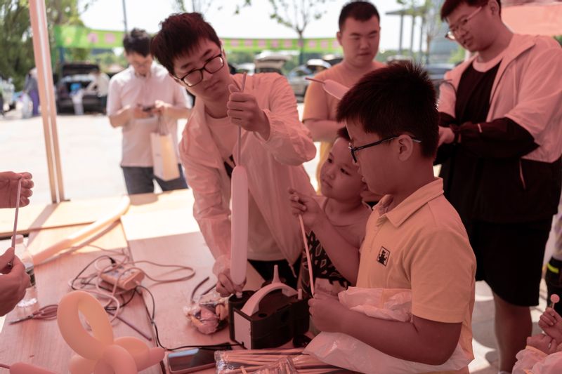 幼兒園老師準備了豐富的親子活動,父子齊上陣、母女同心圓,一起玩彩虹傘、做益智題,加強了親子溝通,拉近了家校之間的距離。全場播放著歡快的音樂,學生志愿者們吹起氣球,捏成不同的造型,吸引了小朋友的圍觀和排隊。親子后備箱集市上打開一個個小商鋪,圖書、玩具種類繁多,小朋友們在攤位上介紹玩具、互換商品,倡導綠色低碳生活,收獲了快樂和友誼。