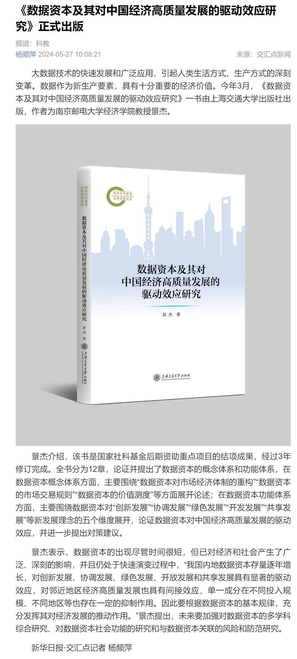 【新華日報客戶端】《數據資本及其對中國經濟高質量發展的驅動效應研究》正式出版