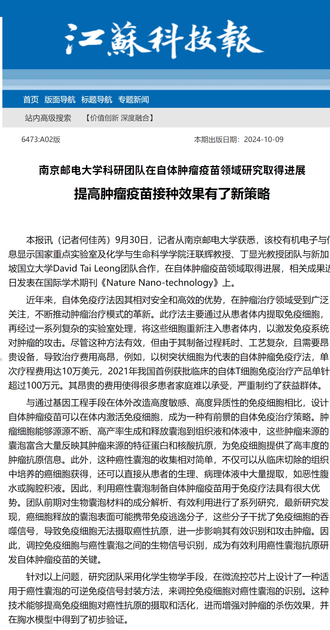 【江蘇科技報】南京郵電大學科研團隊在自體腫瘤疫苗領域研究取得進展 提高腫瘤疫苗接種效果有了新策略