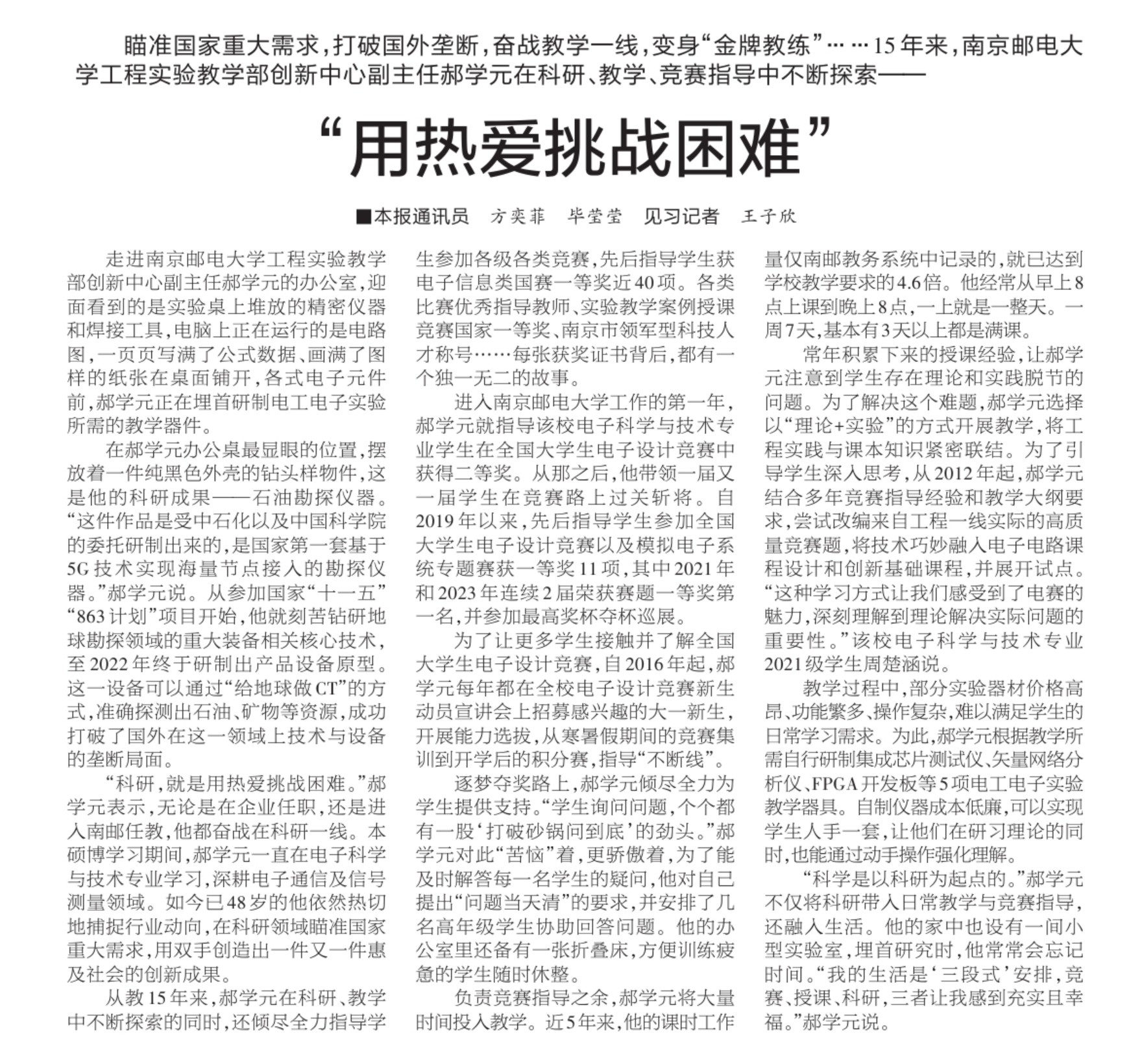 【江蘇教育報】南京郵電大學工程實驗教學部創新中心副主任郝學元在科研、教學、競賽指導中不斷探索——“用熱愛挑戰困難”