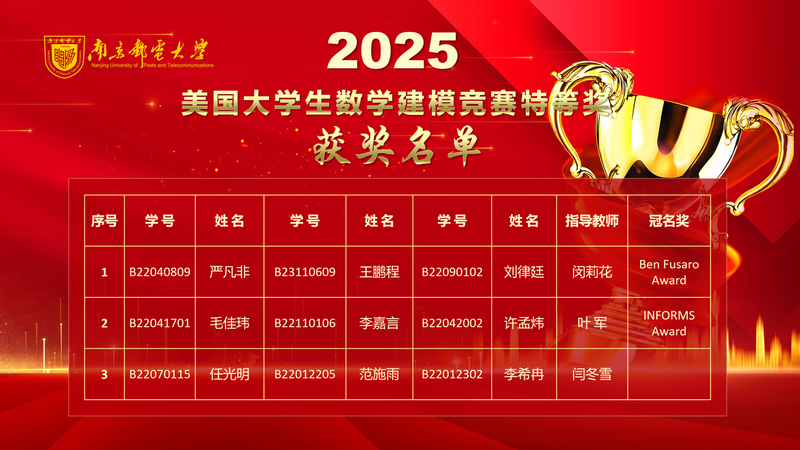 2025年美國大學生數(shù)學建模競賽和跨學科建模競賽結(jié)果近日公布,南京郵電大學獲特等獎(Outstanding Winner)3項,其中2支隊伍兼獲Ben Fusaro Award(本?富薩羅獎)和INFORMS Award,特等獎數(shù)量并列全球第一,這是繼2024年在全國大學生數(shù)學建模競賽中取得大滿貫成績后的新突破。