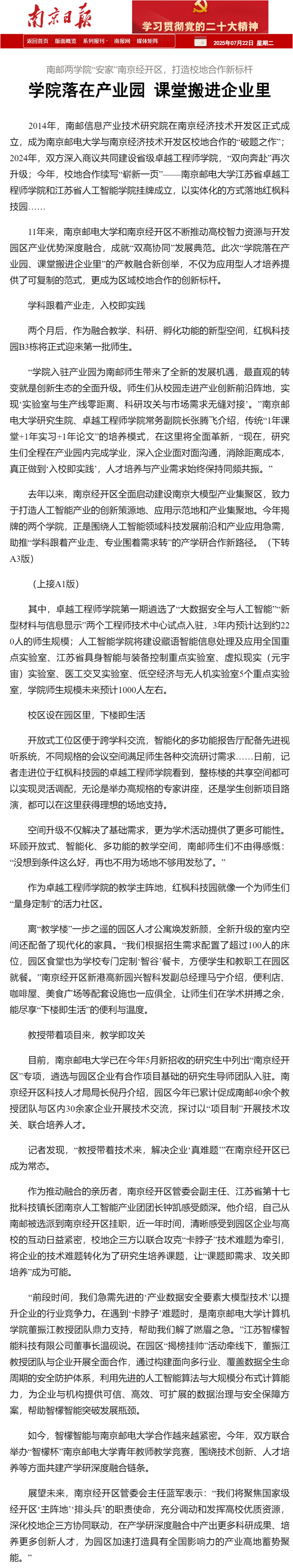 【南京日報頭版】學院落在產業園 課堂搬進企業里