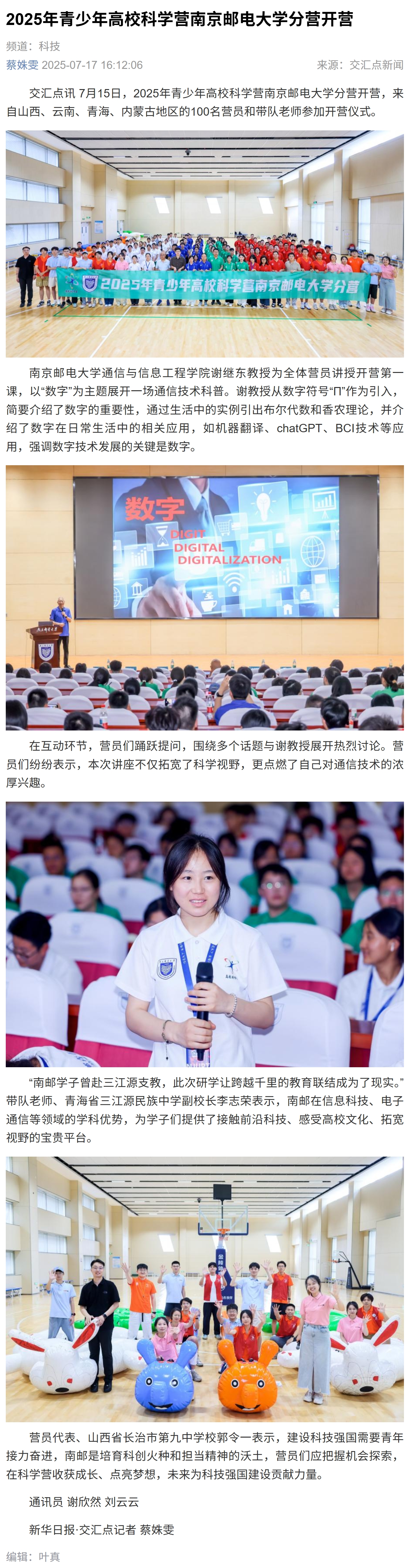 【新華日報客戶端】2025年青少年高校科學營南京郵電大學分營開營
