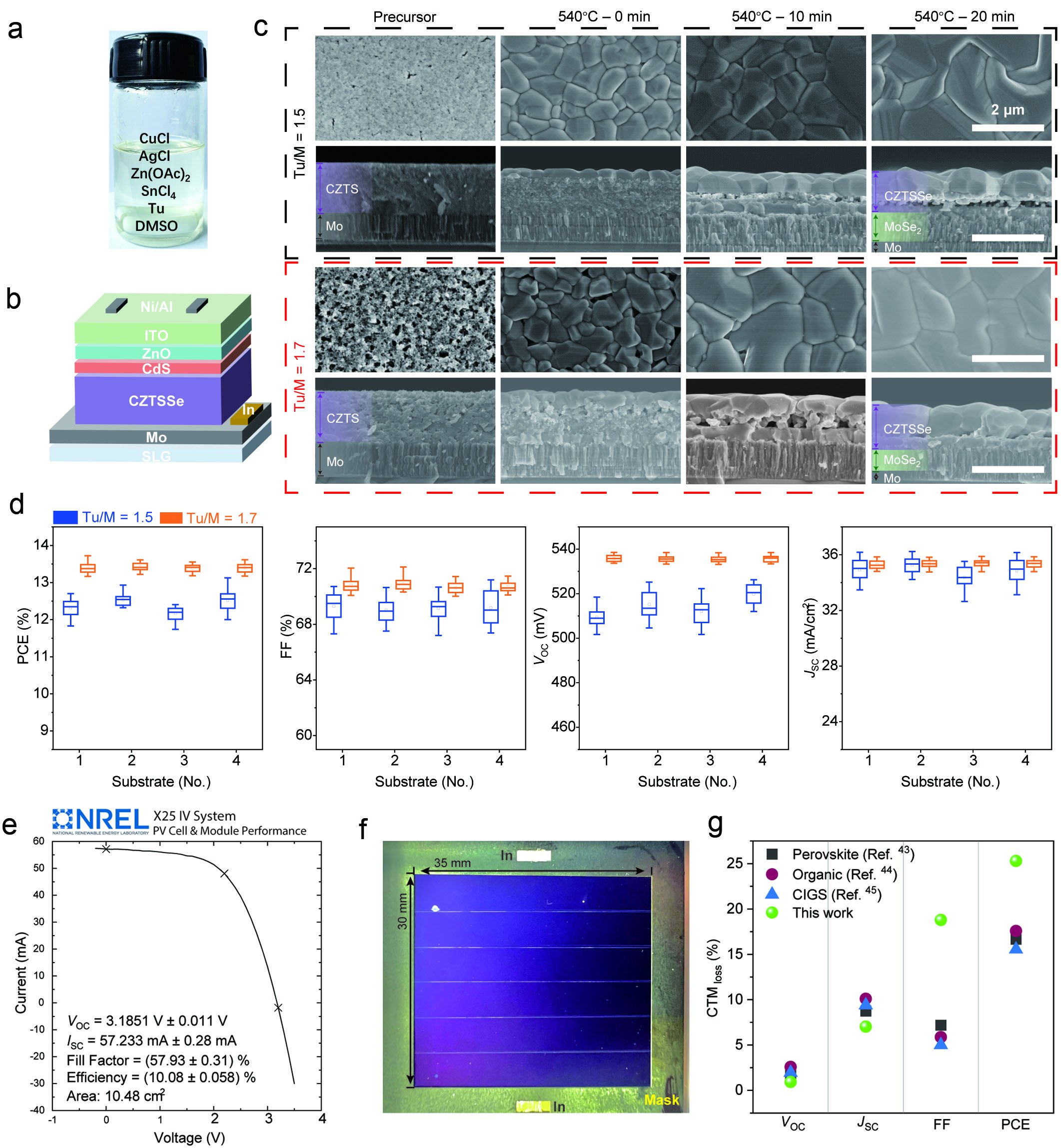 (a) 前驅(qū)體溶液照片,(b) CZTSSe太陽能電池結(jié)構(gòu)示意圖,(c) 不同組分溶液(Tu1.5,Tu1.7)制備的前驅(qū)薄膜與吸收層薄膜在不同硒化階段的表面及截面SEM圖像,(d) Tu1.5與Tu1.7太陽能電池光伏參數(shù)統(tǒng)計(jì)圖,(e) 經(jīng)NREL認(rèn)證的效率為10.08%的CZTSSe組件I-V曲線圖,(f) 認(rèn)證組件正面照片,(g) 薄膜太陽能電池組件(鈣鈦礦、有機(jī)、銅銦鎵硒(CIGS)、CZTSSe組件)CTM(Cell to Module)損失對比。