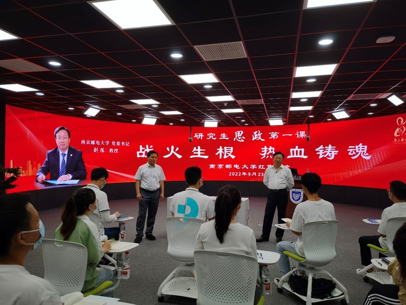 賡續紅色血脈,培育時代新人。9月23日,校黨委劉陳書記以《戰火生根 熱血鑄魂》為題主講“思政第一課”。他從“學史鑄魂:學習南郵校史的重要意義”“南郵發源:抗日戰爭時期的戰郵干訓班”“數易校名:在解放戰爭中輾轉壯大”“定址南京:結束8年的戰爭歲月辦學歷史”“賡續精神:繼承和發揚南郵的紅色基因”五個部分,用一個個鮮活的人物故事生動詳實地講述了學校紅色校史,寄語研究生要銘記學?!盀辄h育人、為國育才”的使命之“根”,繼承和發揚學?!靶胚_天下,自強不息”的初心之“魂”,珍惜學習時光,樹立遠大理想,胸懷報國之志,勇擔時代使命,敢于主動創新,讓青春在為祖國、為民族、為人民、為人類的不懈奮斗中綻放絢麗之花。