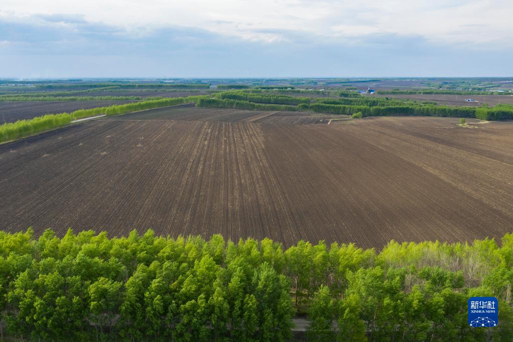 黑龍江省海倫市前進鎮光榮村已完成播種的黑土耕地(2022年5月23日攝,無人機照片)。