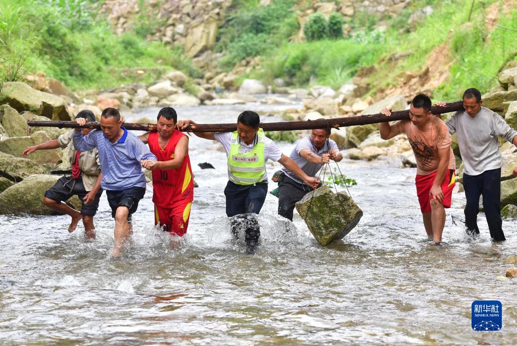 在位于黔桂交界大苗山深處的烏英苗寨,駐村第一書記韋桂華(右四)、黨員梁成兵(右三)、梁志新(左二)帶領村民維修河堤(2019年6月30日攝)。