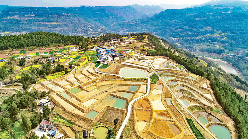 耕地是糧食生產的命根子,必須確保18億畝耕地實至名歸。近年來,四川省巴中市通江縣在山區將零散、異形、坡度較大的土地進行宜機化改造,讓“零碎地”變標準田、閑置土地變良田。圖為2022年3月14日,通江縣鐵佛鎮中嶺村宜機化改造后的土地,進行了玉米大豆帶狀復合種植的田園景色。 求是圖片 程聰/攝