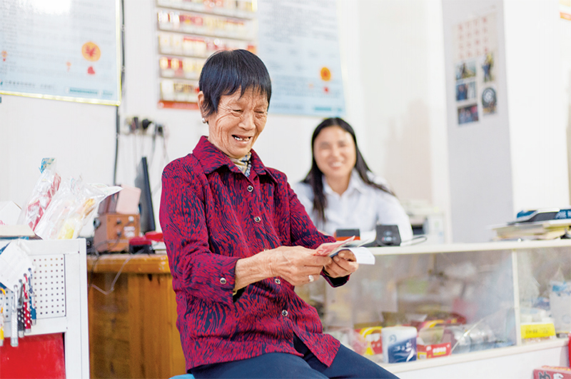 我國(guó)成功建設(shè)了具有鮮明中國(guó)特色、世界上規(guī)模最大、功能完備的社會(huì)保障體系。圖為江西省遂川縣草林鎮(zhèn)拱前村82歲脫貧戶黃茂香在“社保村村通金融服務(wù)便民點(diǎn)”支取養(yǎng)老金,該縣在286個(gè)村設(shè)立此類便民點(diǎn),實(shí)現(xiàn)了所有老人不出村就可輕松支取。 中國(guó)社會(huì)保障雜志社供圖 高敏/攝