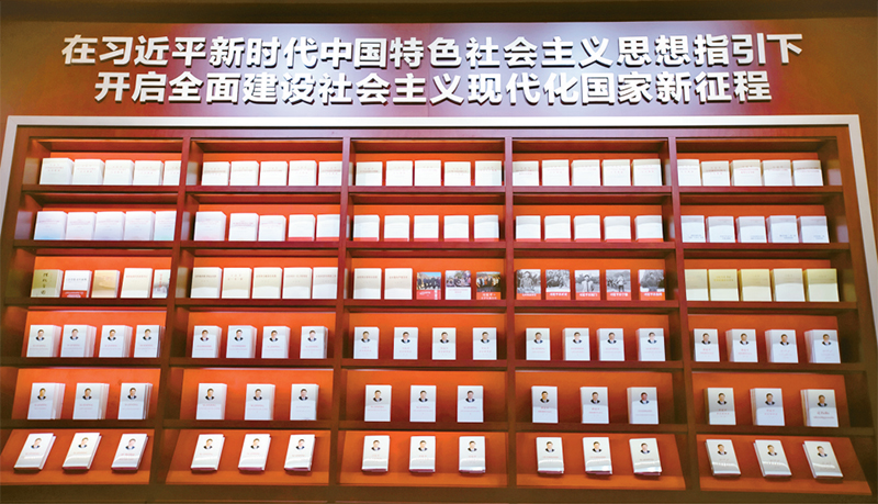 習(xí)近平新時代中國特色社會主義思想以原創(chuàng)性理論貢獻(xiàn)標(biāo)注了馬克思主義發(fā)展的新高度,使馬克思主義的開放性和時代性在中國又一次得到充分彰顯。圖為中國共產(chǎn)黨歷史展覽館展出的習(xí)近平總書記的部分重要著作以及學(xué)習(xí)闡釋習(xí)近平新時代中國特色社會主義思想的部分重點圖書。 劉新武/攝