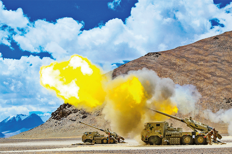 初夏時節,陸軍某火力團展開多火器跨晝夜實彈射擊演練。圖為某新型火炮實施遠程火力打擊。