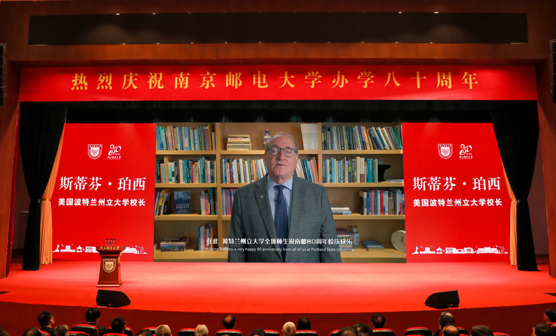海外高校代表、美國(guó)波特蘭州立大學(xué)校長(zhǎng)斯蒂芬?珀西通過視頻致辭,向南京郵電大學(xué)表達(dá)了熱烈的生日祝賀。他介紹波特蘭州立大學(xué)與南京郵電大學(xué)共建的波特蘭學(xué)院目前教學(xué)規(guī)模已達(dá)到500多人,期待波特蘭州立大學(xué)的校園能夠在2023年迎來南郵師生開展科研合作和教育項(xiàng)目研討,并希望未來能與學(xué)校建立更多合作項(xiàng)目。
