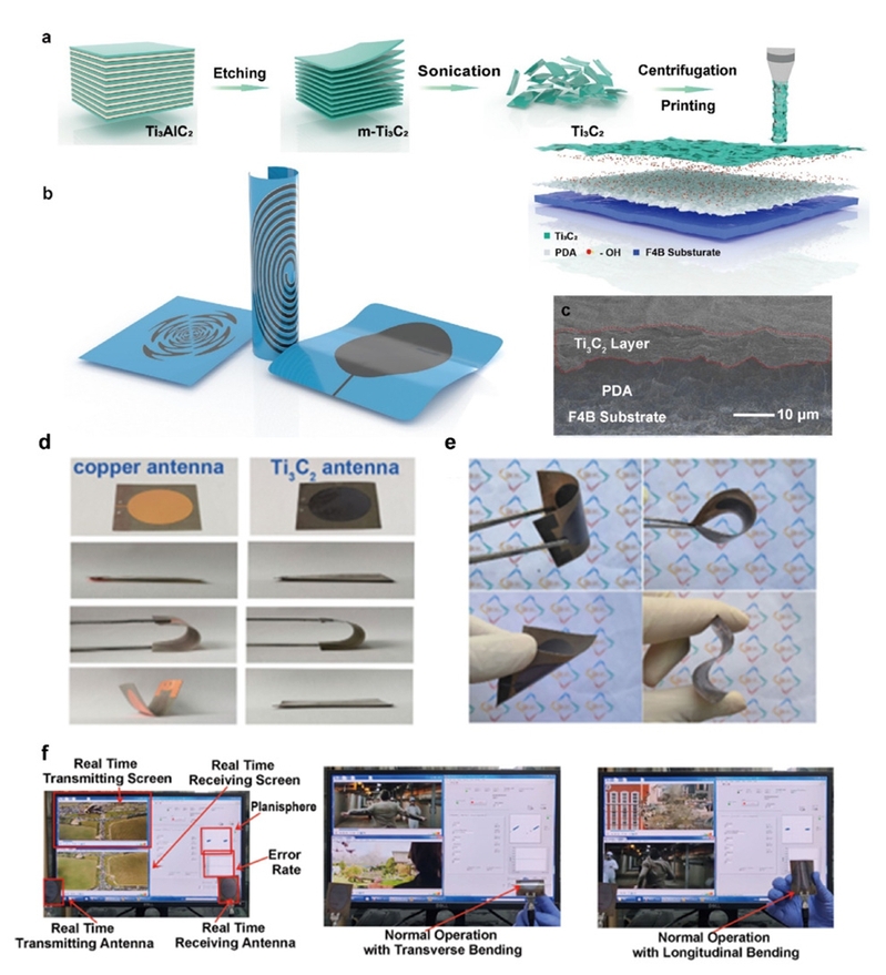 針對介質襯底和無添加劑Ti3C2油墨的共形集成受到限制這一問題,該工作提出“分子膠水”界面改性工藝,采用聚多巴胺分子對柔性介質基板進行改性,增強了印刷的Ti3C2傳輸層與介質基板表面的粘附作用力,制備了具有高空間均勻性的柔性超寬帶Ti3C2單極子天線,實現了優異的彎折穩定性與實時的信息傳輸效果。通過改變墨水濃度、印刷層數等參數,可以進一步調節天線傳輸性能,實現可控的無線信息傳輸功能。