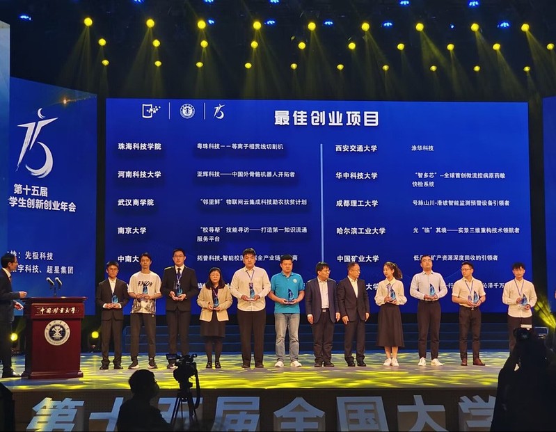 5月12-14日,由教育部主辦的第十五屆全國大學生創新創業年會在中國礦業大學舉行,我校電子與光學工程學院、柔性電子(未來技術)學院趙強教授和王龍祿副教授指導、本科生劉明鳴團隊完成的創業實踐項目“智能凈水——行到水窮處,沁澤千萬家”獲得“最佳創業項目”,趙強教授和南京水聯天下水處理科技研究院有限公司董事長董平獲得“優秀指導教師”稱號,這是我校首次在全國大學生創新創業年會獲得創業類項目獎項。