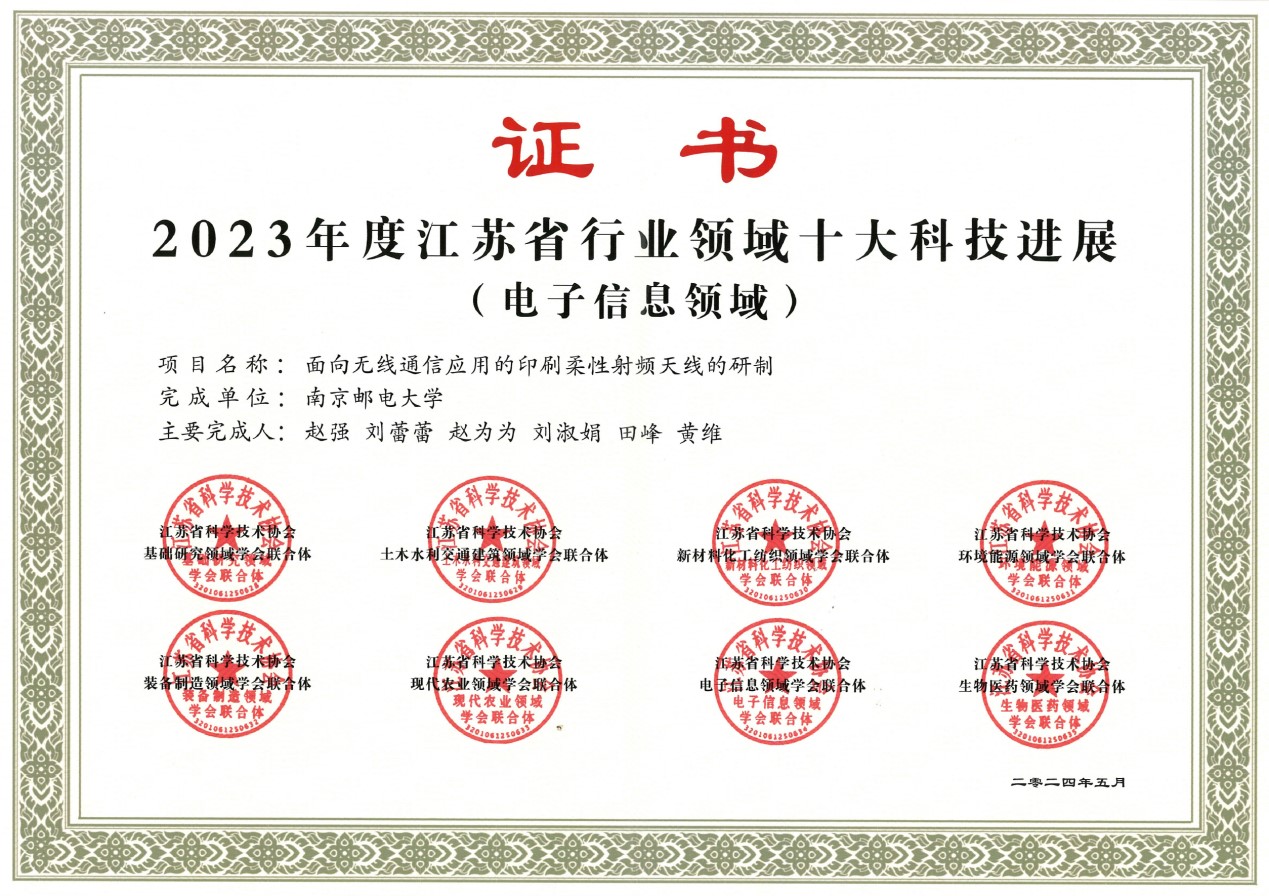 在第八個全國科技工作者日來臨之際,由江蘇省科學技術協會、江蘇省科學技術廳主辦的2024年全國科技工作者日江蘇省主場活動在南京舉行。會上,發布了2023年度江蘇省行業領域十大科技進展。南京郵電大學有機電子與信息顯示國家重點實驗室黃維院士、趙強教授團隊聯合射頻集成與微組裝技術國家地方聯合工程實驗室劉蕾蕾教授團隊、寬帶無線通信與傳感網技術教育部重點實驗室田峰教授團隊完成的“面向無線通信應用的印刷柔性射頻天線的研制”成果入選“電子信息領域”十大科技進展。