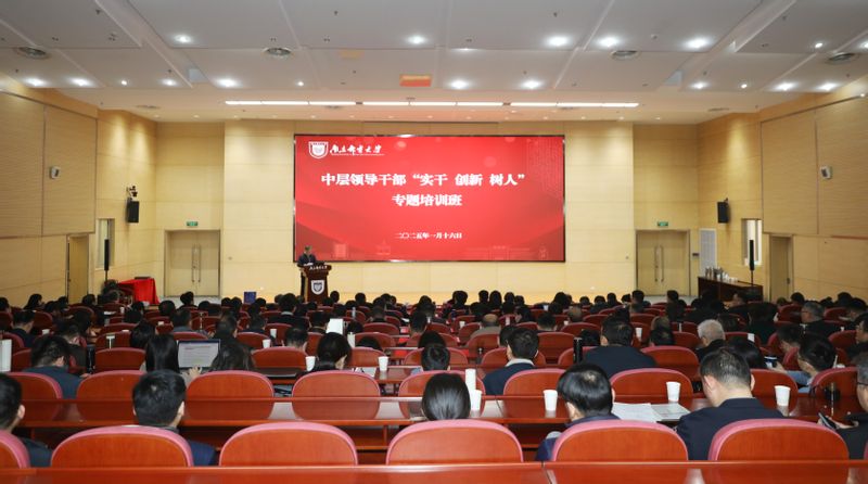 為持續抓好學校內涵建設,推動高質量發展,鍛造一支講政治、重實干、懂業務、善創新、知敬畏的高質量干部隊伍,凝聚高質量發展的強大人才力量,1月16日至17日,學校黨委在仙林校區圖書館運滿滿報告廳舉辦中層干部“實干、創新、樹人”專題培訓班。全體校領導出席開班儀式,校黨委書記郭宇鋒作開班動員講話,中層干部參加培訓。