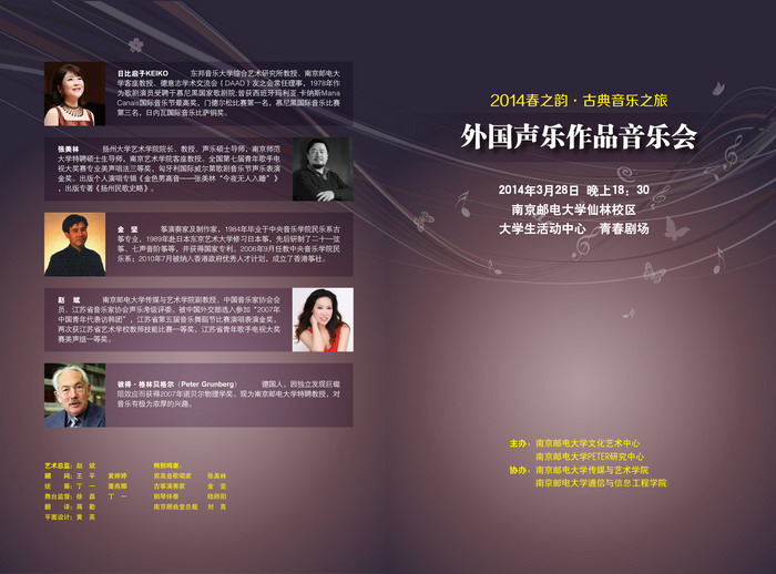 由南京郵電大學文化藝術中心、Peter研究中心主辦,傳媒與藝術學院、通信與信息工程學院承辦的“2014春之韻?古典音樂之旅——外國聲樂作品音樂會”會將于2014年3月28日(周五)下午18:30分在仙林校區大學生活動中心青春劇場舉行。 歡迎廣大師生前來欣賞。 南京郵電大學文化藝術中心 Peter研究中心 2014年3月25日