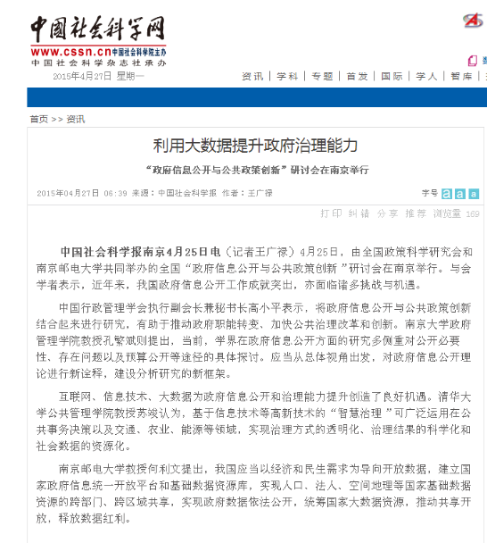 【中國社會科學報】利用大數據提升政府治理能力 “政府信息公開與公共政策創新”研討會在南京舉行