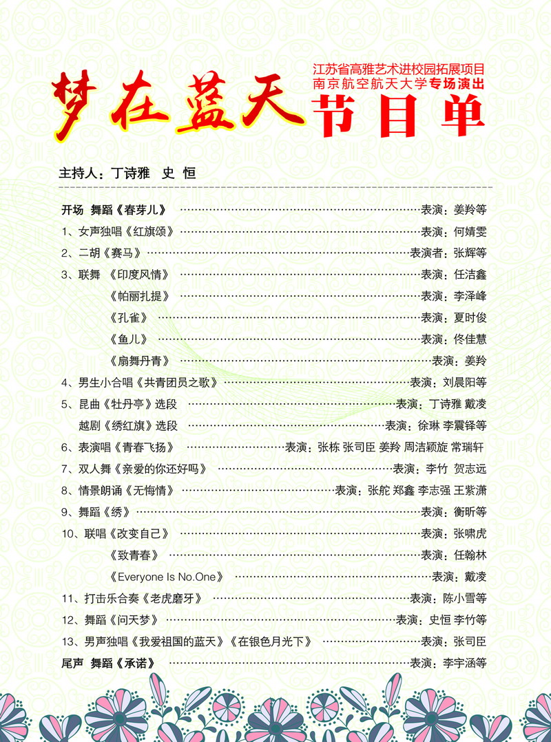 | 關于高雅藝術進校園——“夢在藍天”南京航空航天大學歌舞團專場演出的通知 |