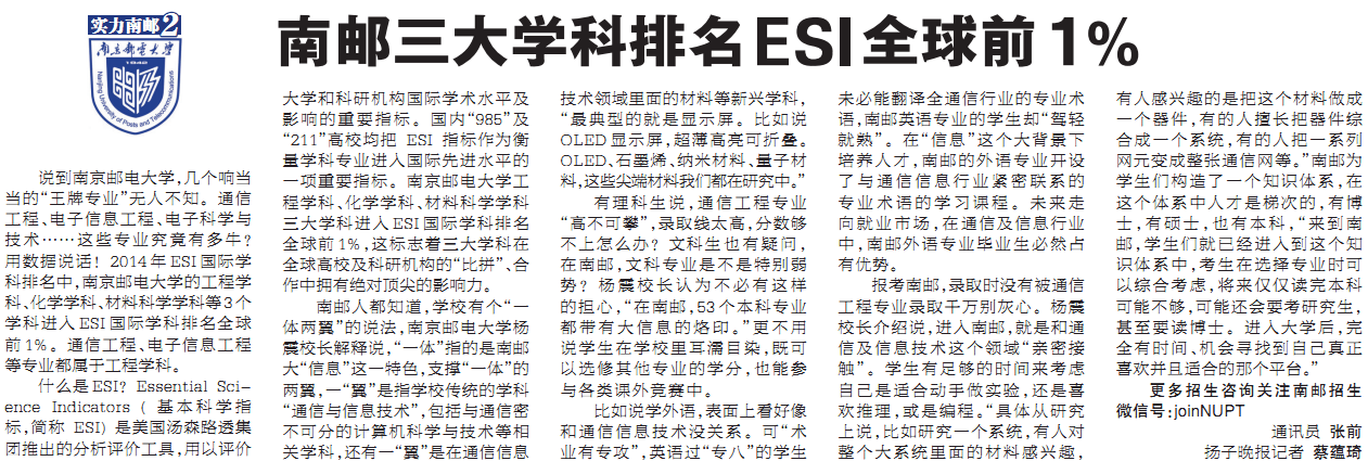 【揚子晚報】南郵三大學科排名ESI全球前1%