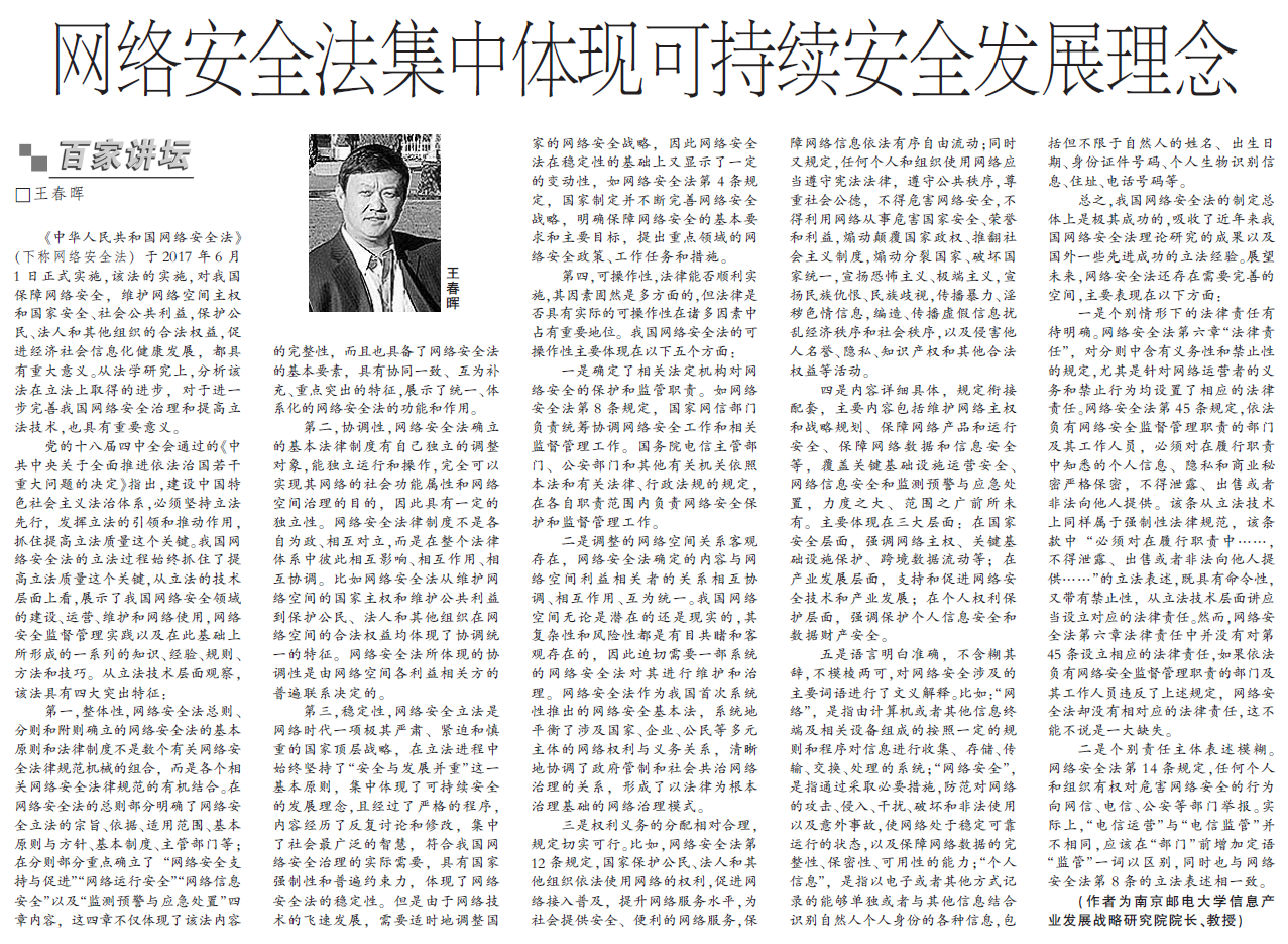 【檢察日報】網絡安全法集中體現可持續安全發展理念