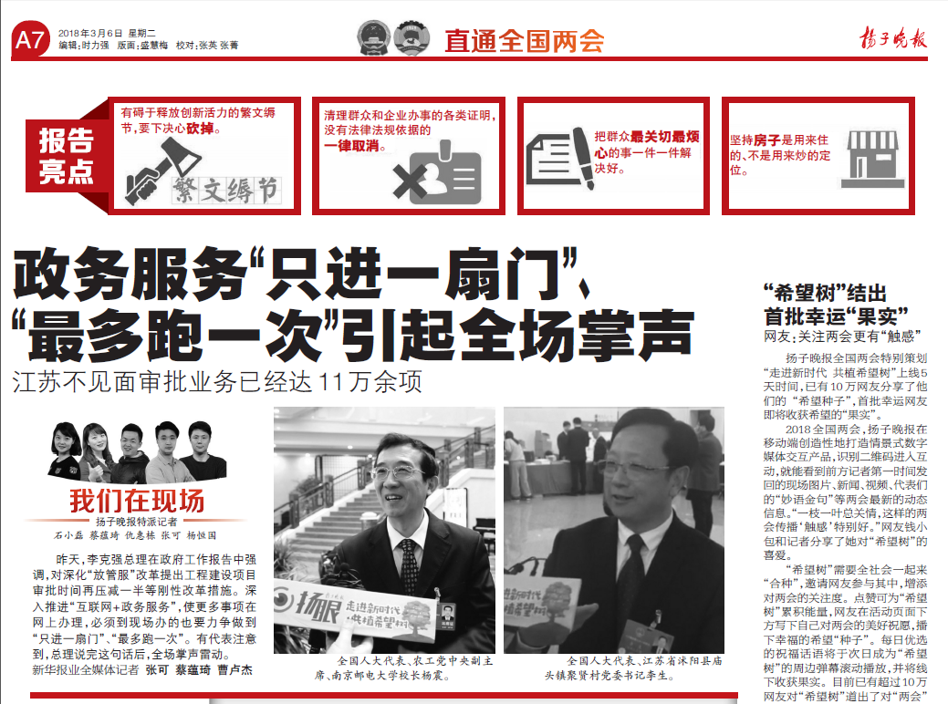 【揚子晚報】政務服務“只進一扇門”、“最多跑一次”引起全場掌聲
