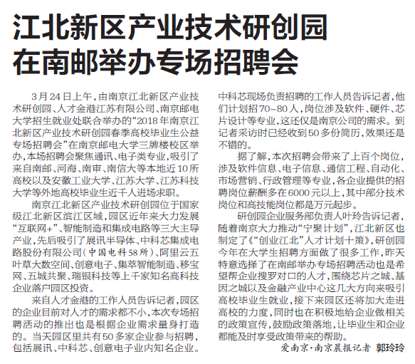 | 【南京晨報(bào)】江北新區(qū)產(chǎn)業(yè)技術(shù)研創(chuàng)園 在南郵舉辦專(zhuān)場(chǎng)招聘會(huì) |