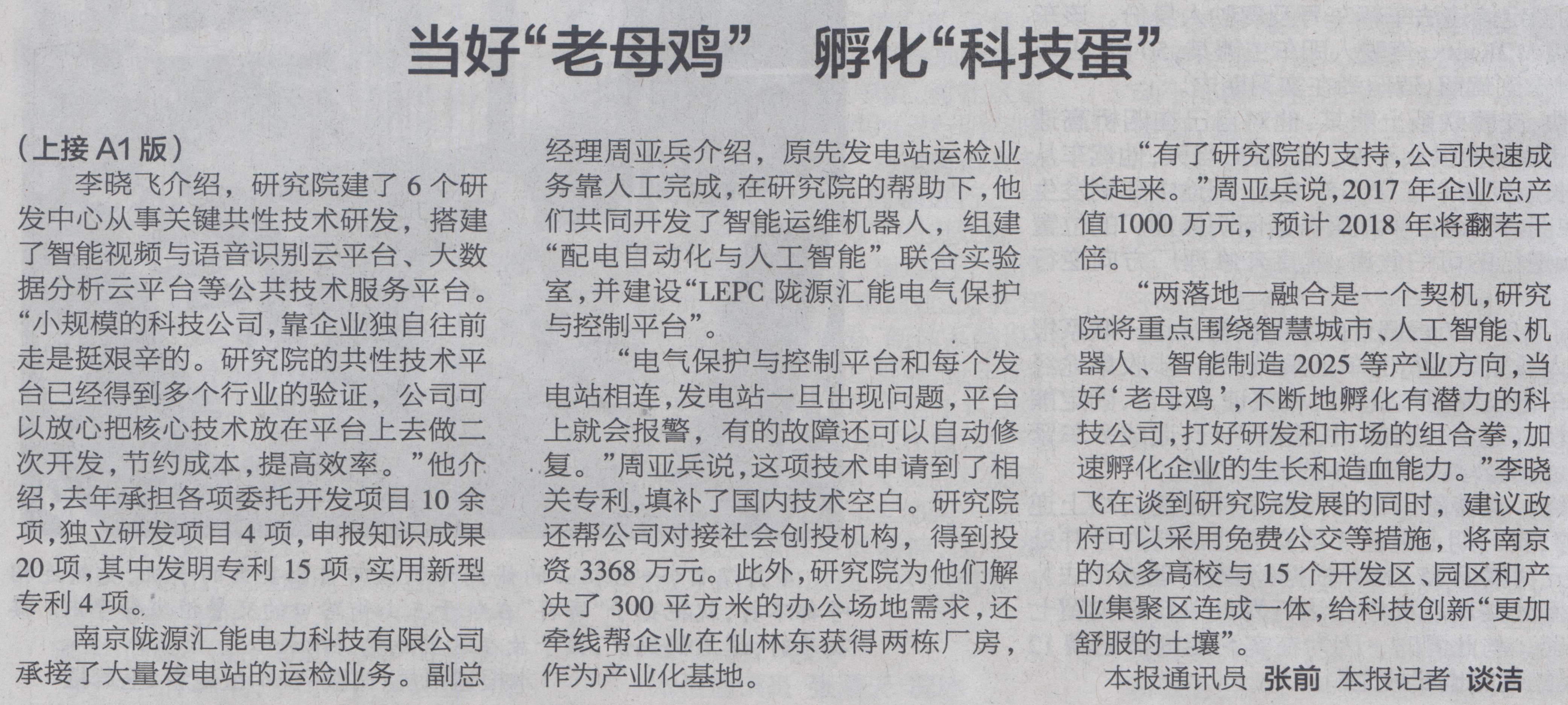 【南京日報】頭版:當好“老母雞” 孵化“科技蛋”