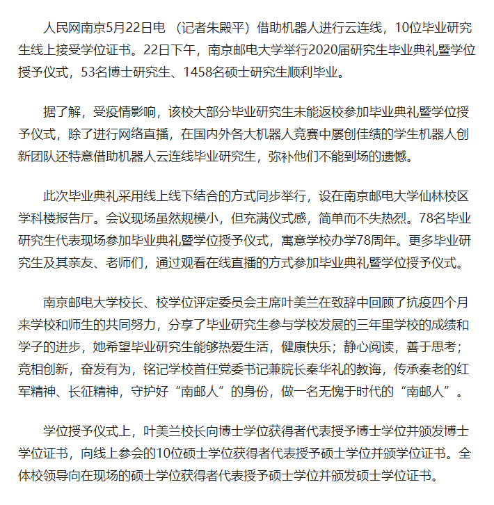 | 【人民網(wǎng)】南京郵電大學(xué)舉辦云畢業(yè)典禮 機器人代領(lǐng)學(xué)位證 |