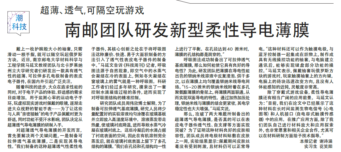 | 【新華日報】南郵團隊研發新型柔性導電薄膜 |