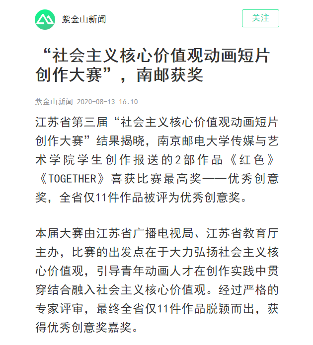 | 【南京日報客戶端】“社會主義核心價值觀動畫短片創(chuàng)作大賽”,南郵獲獎 |