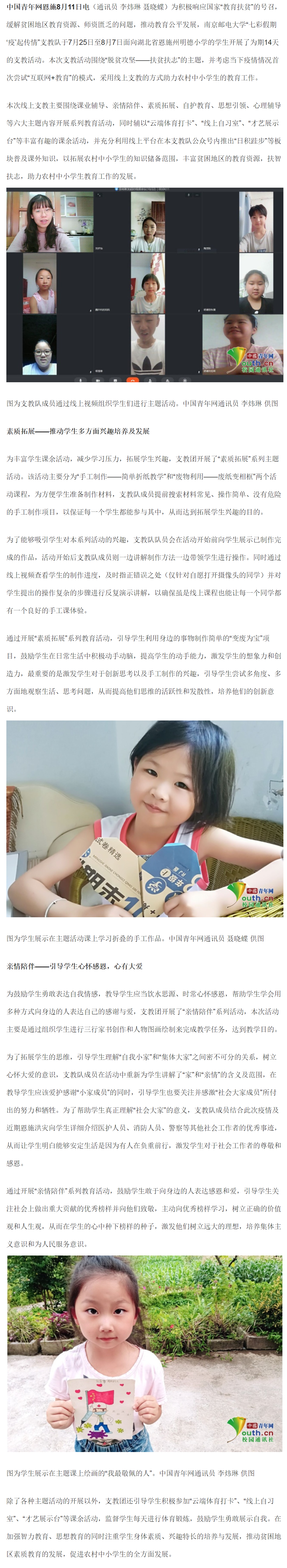 | 【中國青年網】南京學子開展線上支教,助力農村中小學教育工作 |