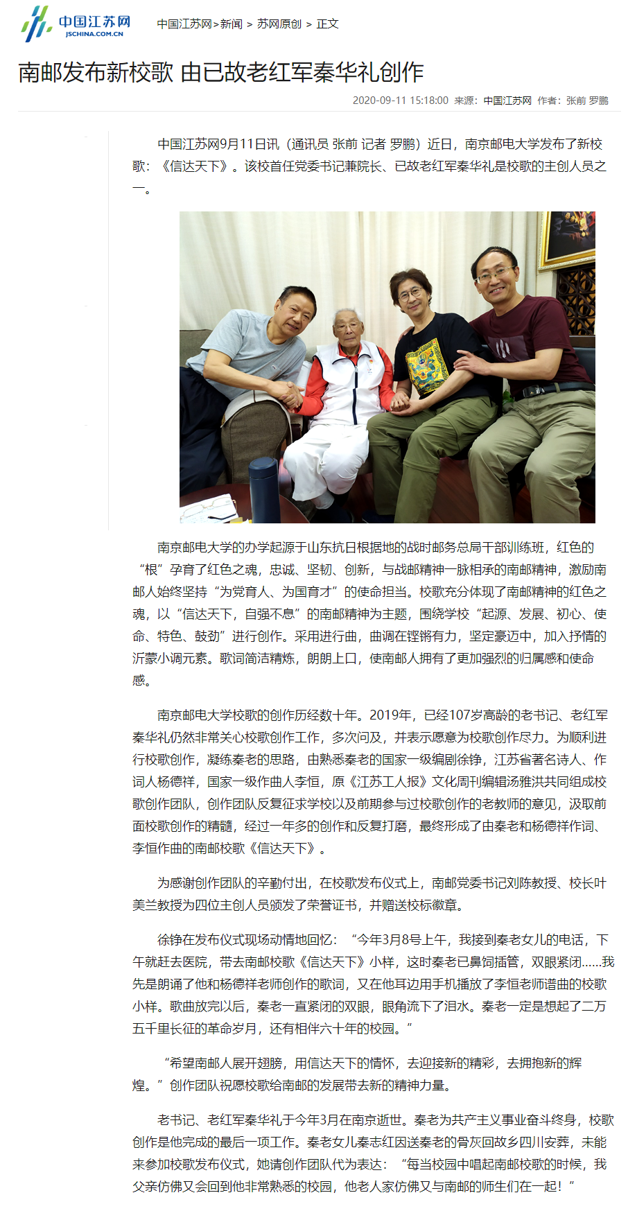 | 【中國江蘇網】南郵發布新校歌 由已故老紅軍秦華禮創作 |