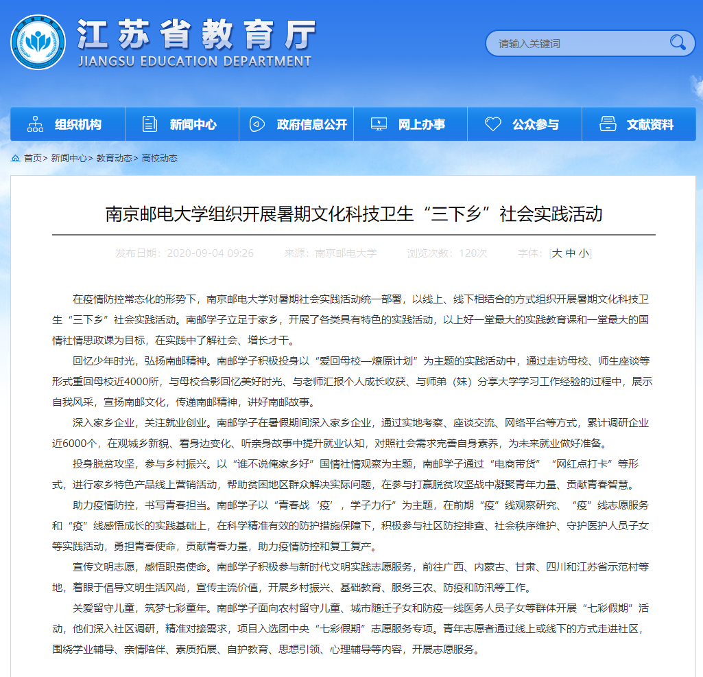 | 【省教育廳官網】南京郵電大學組織開展暑期文化科技衛生“三下鄉”社會實踐活動 |