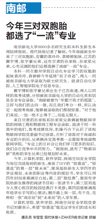 | 【現代快報】南郵:今年三對雙胞胎都選了“一流”專業 |