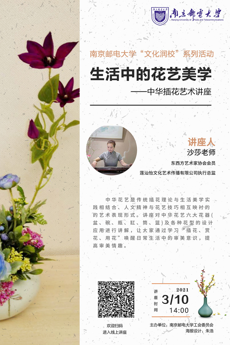 學校工會將于2021年3月10日14:00舉行“生活中的花藝美學——中華插花藝術講座”活動。 歡迎收看。直播網址:https://play.yunxi.tv/pages/6d8fdbfb202e4038aef36a4326195803