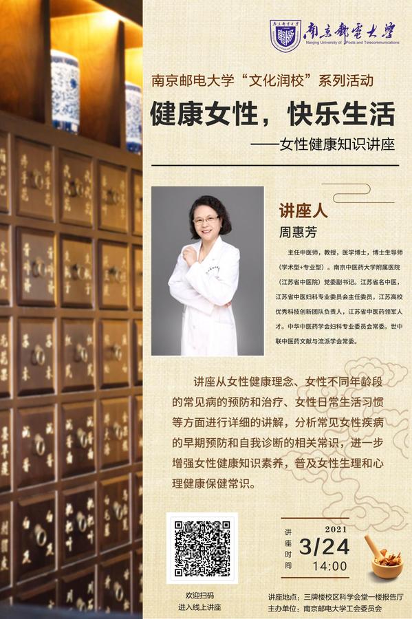 校工會將于2021年3月24日14:00,在三牌樓校區科學報告會堂一樓報告廳、舉辦“文化潤校”系列活動之“健康女性、快樂生活——女性健康知識講座”。 歡迎光臨、收看。